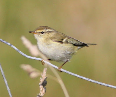 Yellow-browed Warbler at Valyie with upto 4 present at this site today This Autumn has seen another huge invasion of Yellow-browed Warblers and during our stay we must have seen around 200 of this exciting species. News of a Two-barred Greenish Warbler had been seen in the Orkneys and when I checked these pictures, I noticed that the upper wing-bar was very indistinct quite similar to that of a Two-barred Greenish and the first pictures do not show the pale tips of the tertials, so I was somewhat relived that the last picture shows one wing slightly raised and clearly shows the pale tips to the tertials eliminating Two-barred Greenish.
