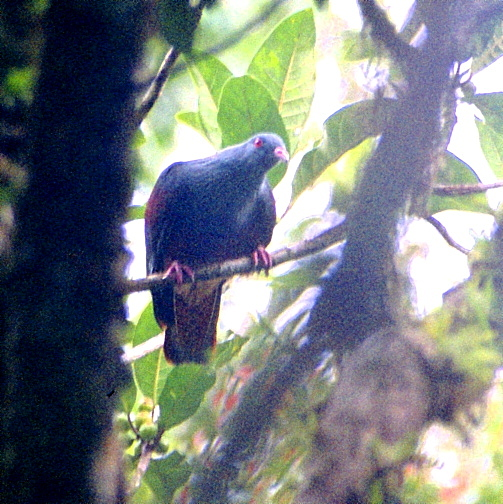 A large pigeon larger than our own Woodpigeon with a long tail and often quite tame feeding quietly in the trees. A very loud booming call and the call carries for a long distance. General colouration dark greyish upper parts with the underparts and under tail coverts chestnut . The top of the tail has a broad dark greyish band on the tip with a chestnut central area. Feet reddish and the bill which appeared quite long and heavy for a pigeon red with broad dark tip.