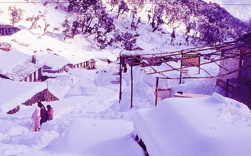 higher elevations - we took the risk of heading up. Conditions were dangerous walking through deep snow up to our waists. Ended up soaking wet, due to large amounts of snow falling off the trees. Fell over many times due to the layer of ice beneath the snow. Finally made it to Ghorepani after 8 hours feeling absolutely shattered. Partially revived by some tomatoes crushed in boiling water. After dark some Australians arrived from Tatopani (with some of them suffering from frostbite) having walked through deep snow all the way, telling of 3 people killed in an avalanche along their route.